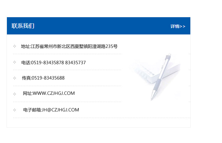 地址:常州市新北區友邦商務大廈1幢16、17層  電話:0519-85101652  傳真:0519-85112595  郵編:213022  網址:www.cz-jiayue_cn.mstgjptj.com  郵箱:xiajifengaa@163.com